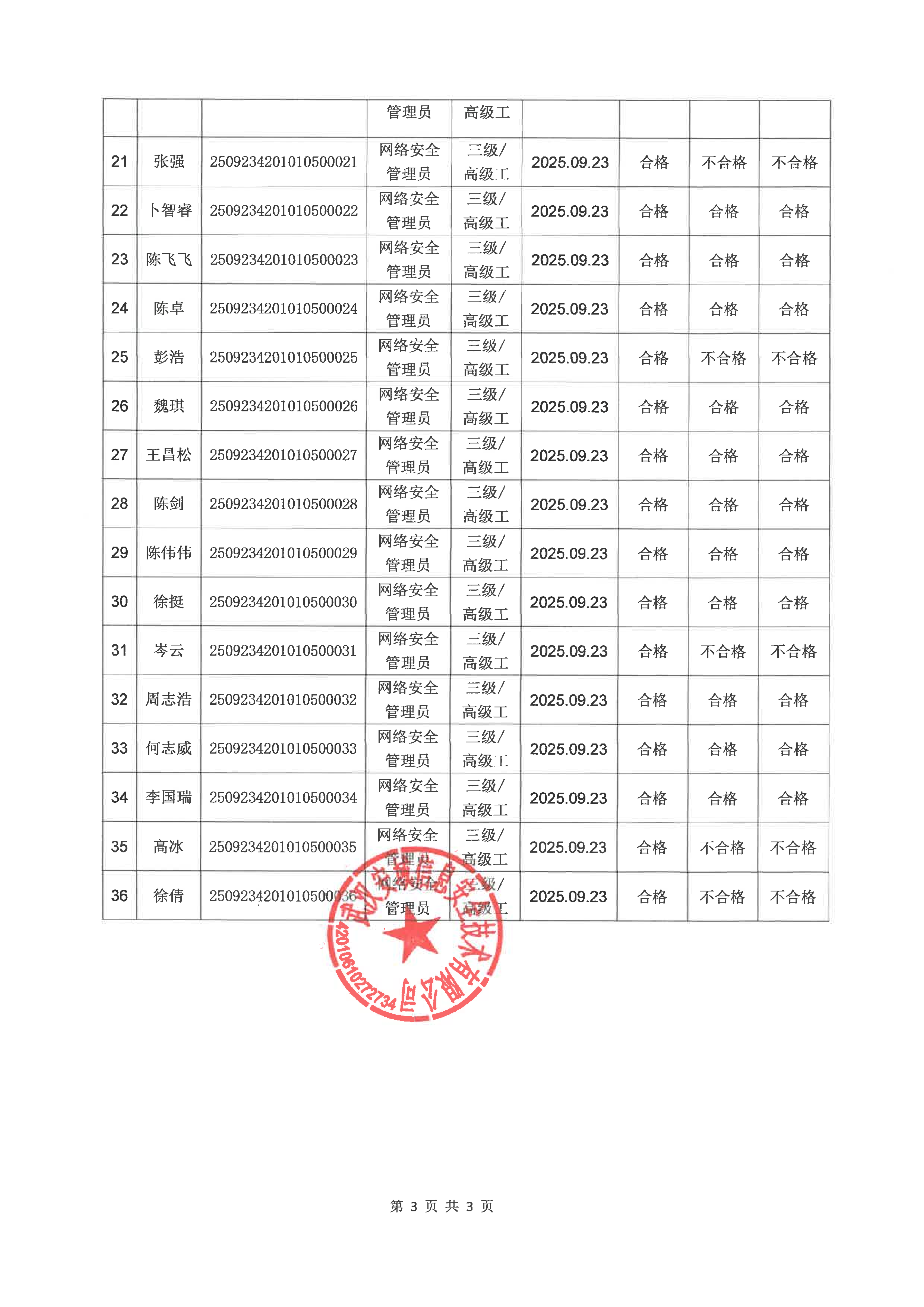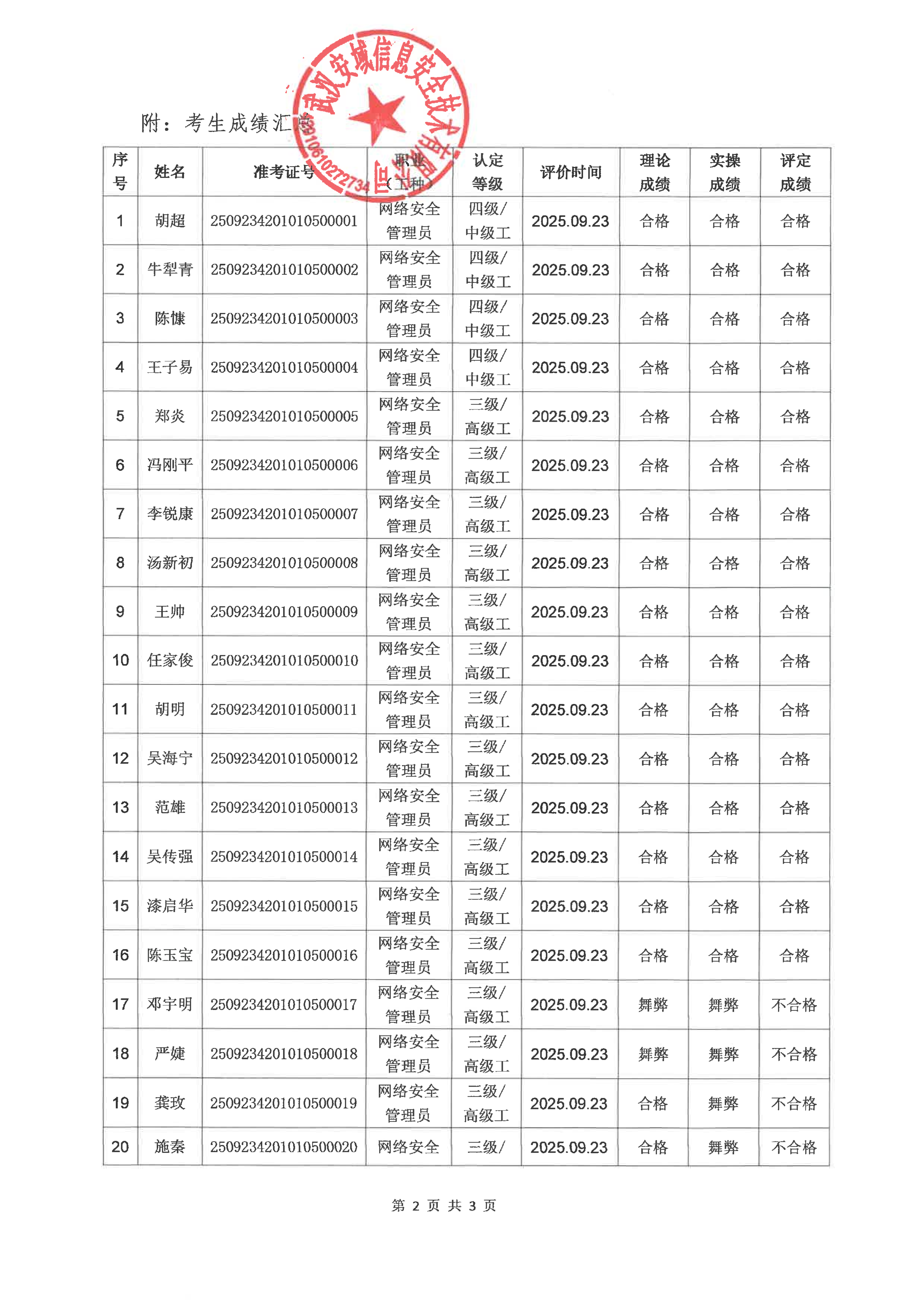 成绩公示 | 武汉安域信息安全技术有限公司20250809网络与信息安全管理员(网络安全管理员)职业技能等级认定考生成绩公示